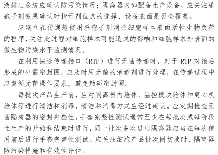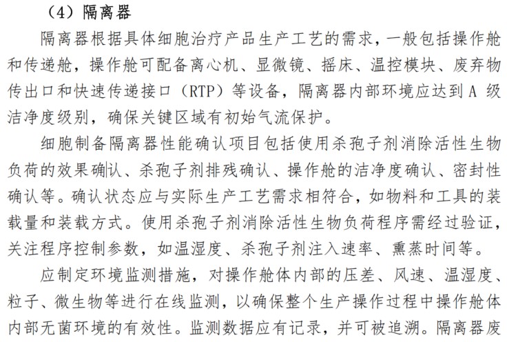 隔离器是细胞治疗产品生产的常见设备,是无菌生产的必要条件,《指南》中对隔离器的要求主要包括以下几个方面: